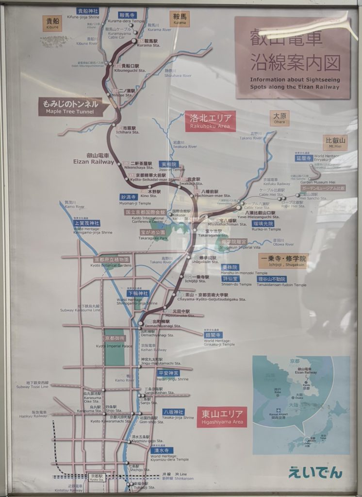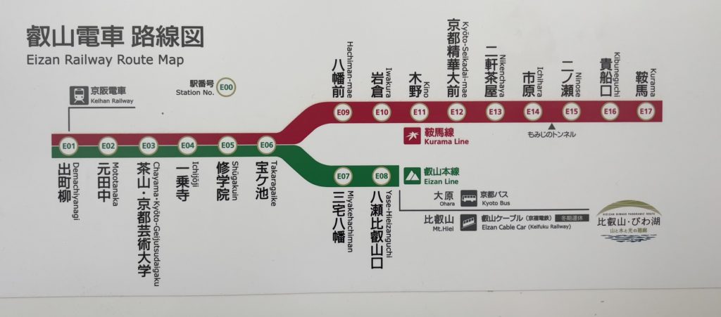 The Eizan Electric Railway (commonly known as Eiden) runs through the northeastern suburbs of Kyoto city.There are two lines: one heading toward Mt. Hiei from Demachi-yanagi Station, and another heading toward Kurama and Kibune.